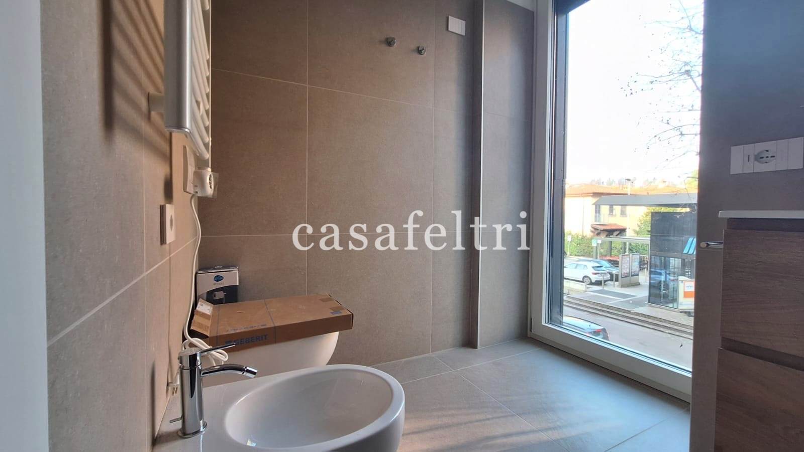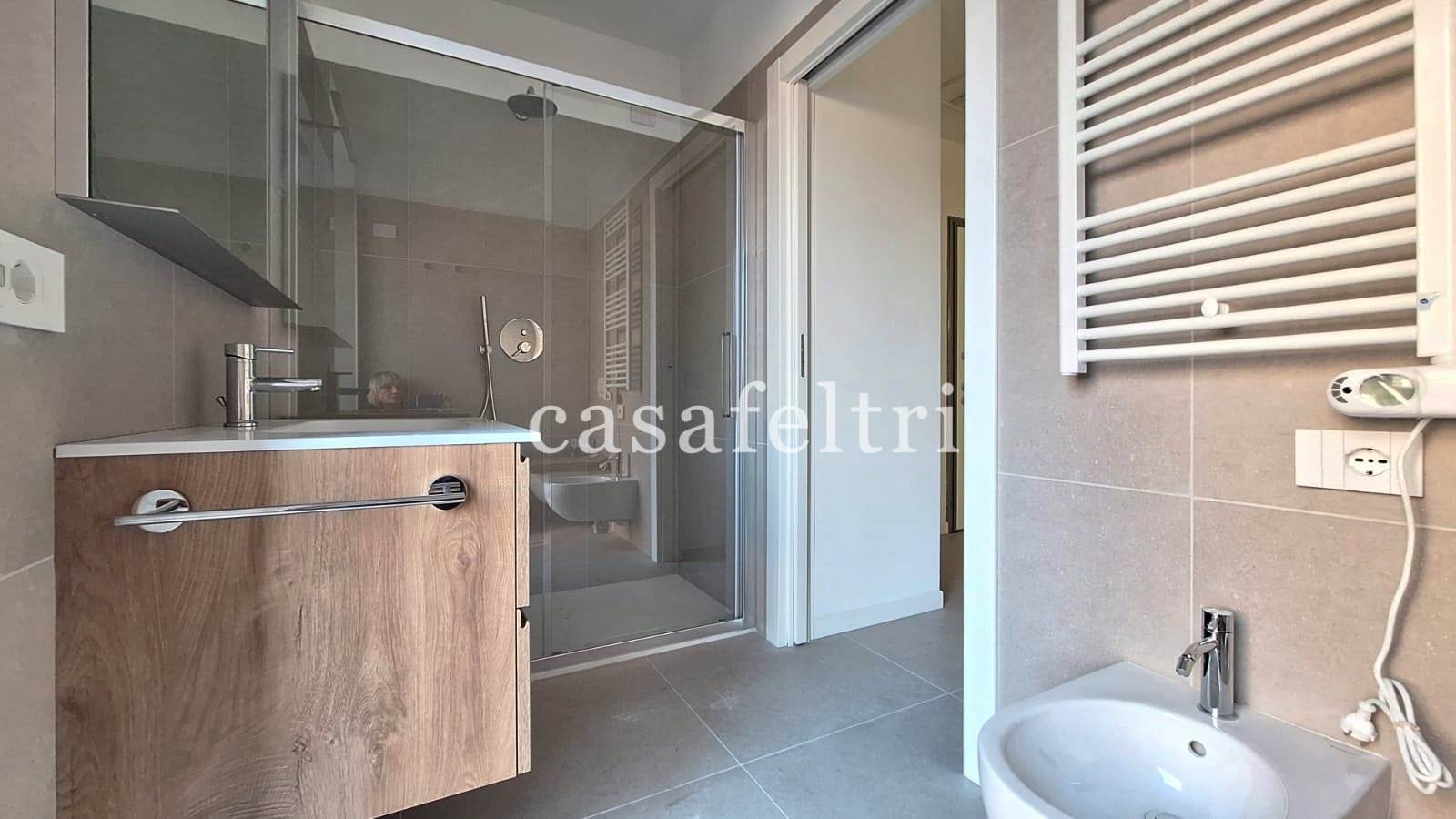 Il bagno, moderno e funzionale, completa la disposizione degli spazi.