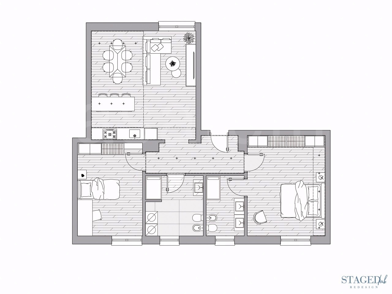L’appartamento internamente e’ composto da : ingresso, comodo soggiorno con cucina openspace, due camere matrimoniali e due ampi bagni finestrati di cui uno padronale.